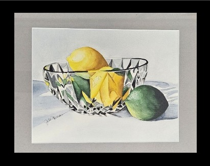 Bring the tastes of summer to your home decor with this still life watercolor, featuring a glass bowl of lemons and limes, this work is donated by talented artist and LMS grandparent, Julie Murrone. Includes frame.