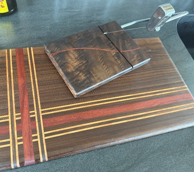 Made from a mixture of Walnut, Curly Maple, and African Paduk, this patterned cutting board and matching cheese slicer will make for an attractive and functional charcuterie presentation at your next gathering.