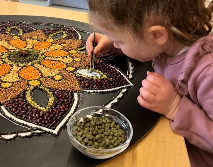 Created by our Children’s House students, this beautiful mandala reflects the foundational elements of Montessori work: concentration, order, coordination, and a deep appreciation for beauty. Through careful placement of color and pattern, each child contributed with intention and focus, embodying the Montessori principles of purposeful work and community collaboration.
