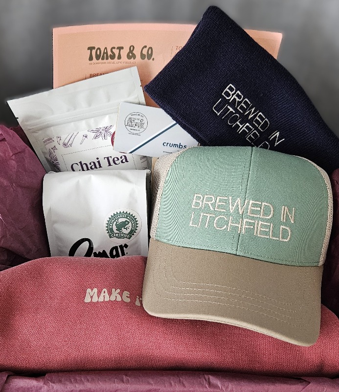 Enjoy the best of local flavor and cozy style with this Toast & Co. Gift Basket! Includes a gift card redeemable at Toast & Co. or Crumbs, plus a comfy sweatshirt, winter beanie, baseball hat, and a bag of coffee to enjoy at home.
