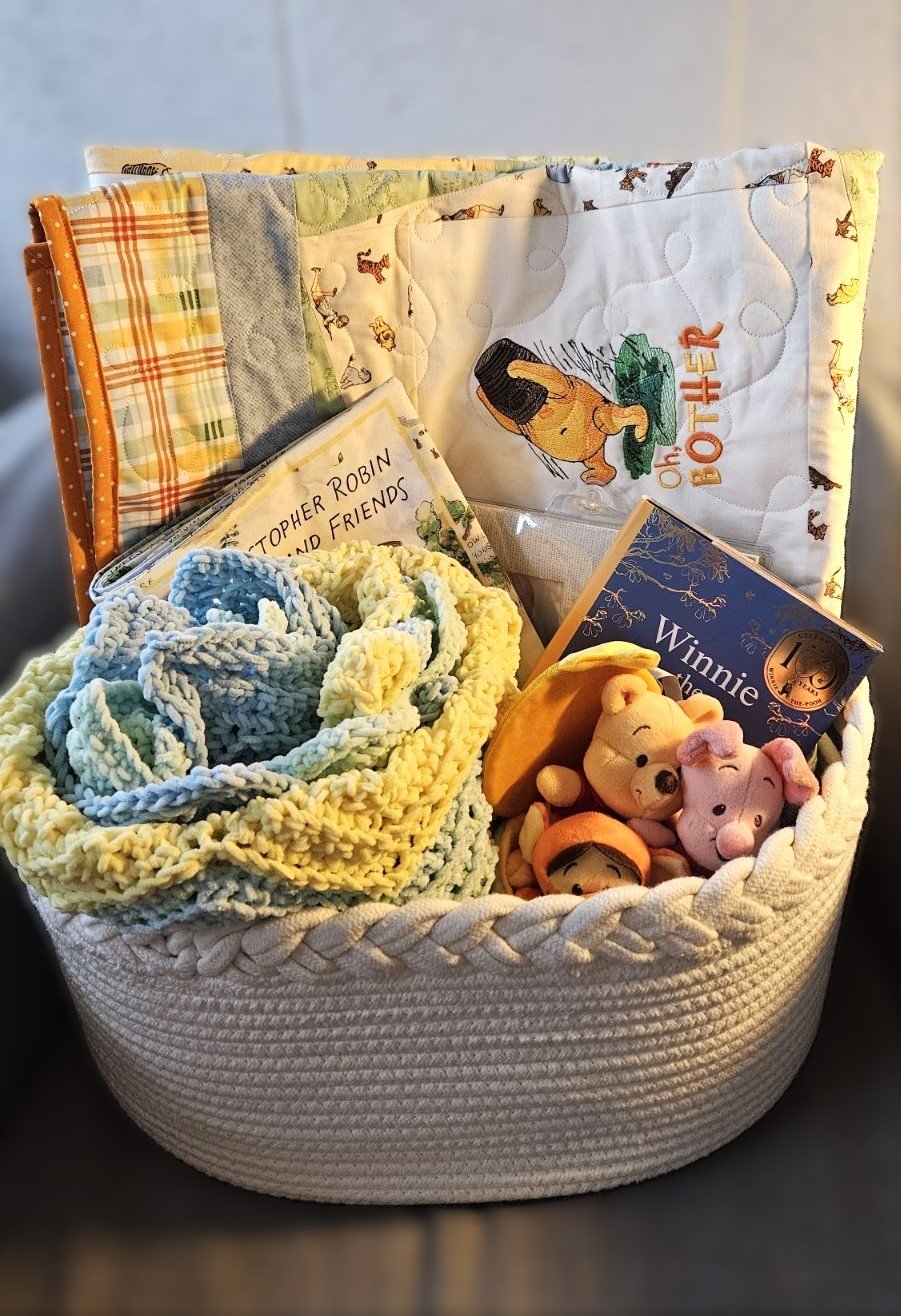 Welcome a little one with this beautifully curated new baby basket! It features a charming handmade Winnie the Pooh–themed quilt, a cozy handmade afghan, and an adorable collection of Pooh treasures, including: Pooh books and stuffed friends, a keepsake baby book, and a sweet frame for capturing special memories. A thoughtful blend of comfort, keepsakes, and essentials, perfect for celebrating a precious new arrival.