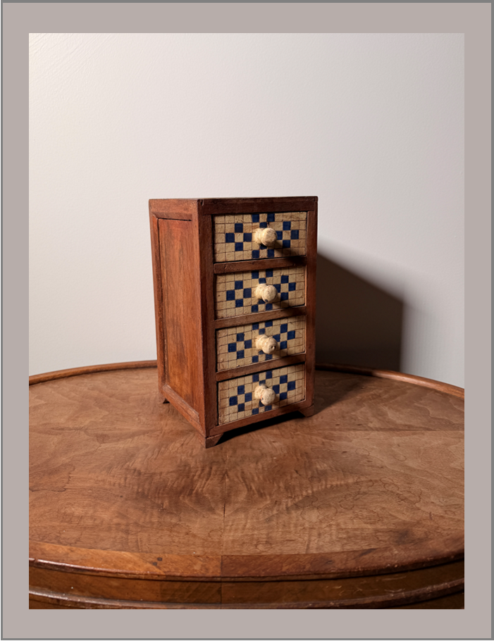 This charming vintage miniature chest of drawers features beautifully detailed inlay, with striking checkerboard marquetry patterns across the drawer fronts, an eye-catching decorative piece for any collector or tabletop display.