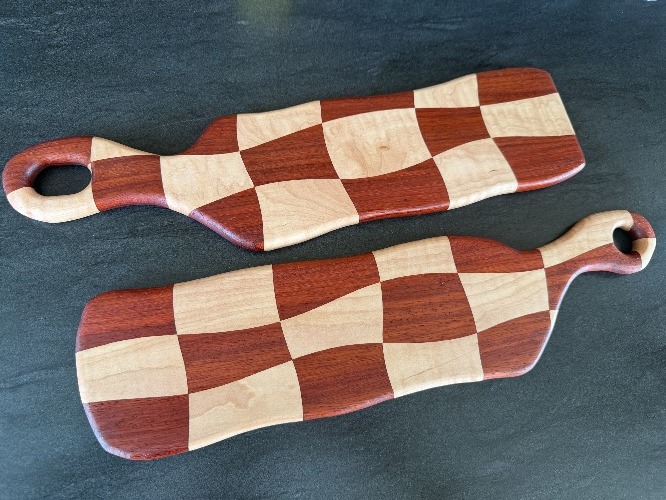 Made from Eastern Curly Maple and African Paduk, this pair of hand made serving boards will become a conversation piece and heighten the aesthetic of any kitchen.