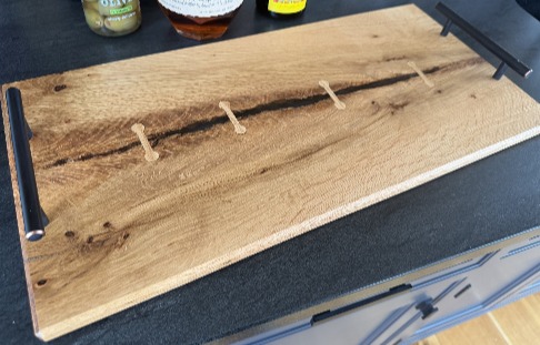Made from local salvaged white oak, this board is one of a kind and features a natural void that has been filled with epoxy. Use it as a decorative piece on your coffee table or as a tea tray.