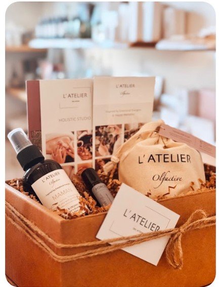 L'ATELIER des artistes, located in New Hartford CT, is a holistic concept studio, spa & wellness center, with a curated boutique of sustainable goods and organic cosmetics. Included in the basket: gift card, hand made toddler winter hat, a bath bomb, and organic holistic mist & roll-on.